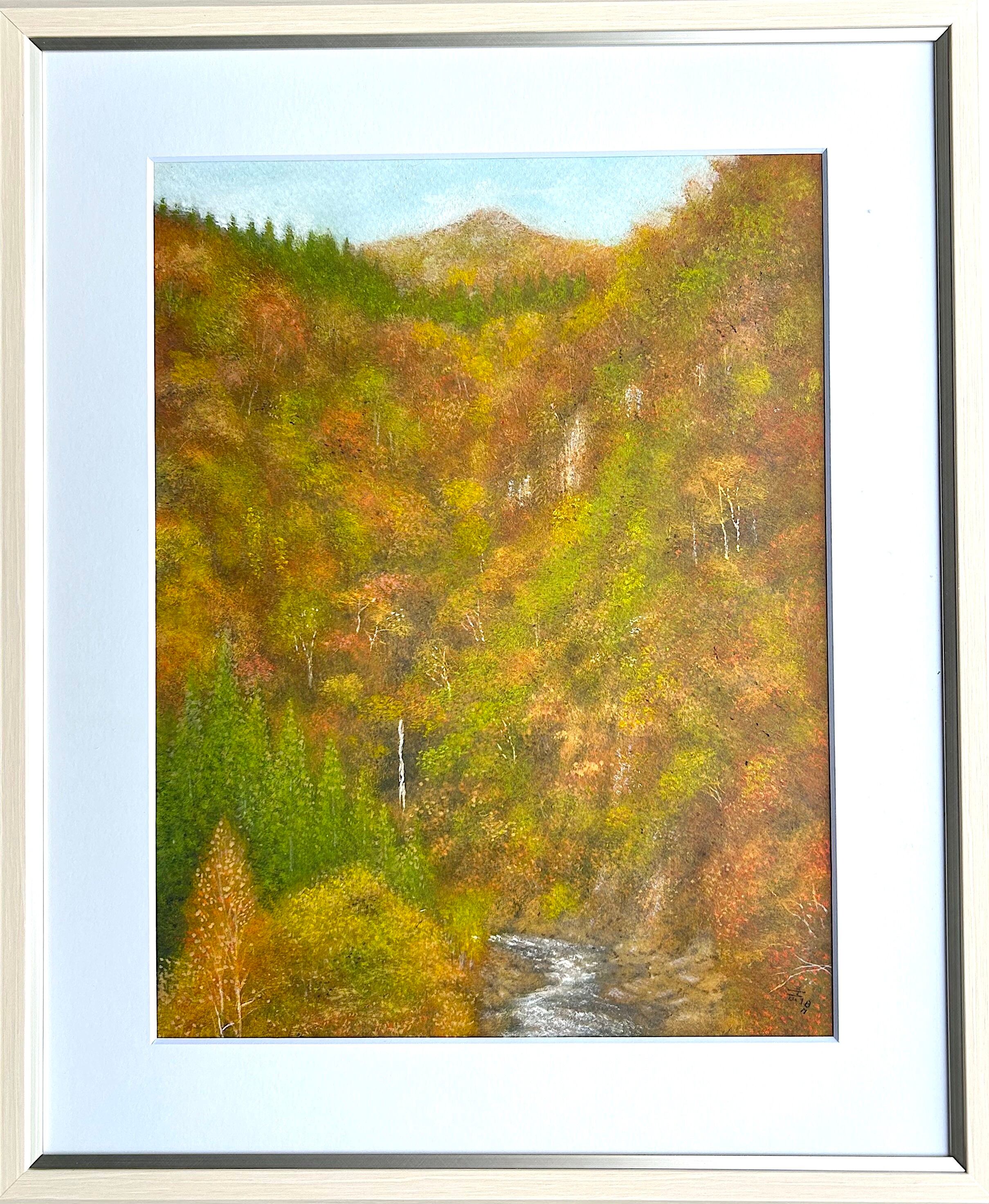 紅葉が映える深秋の谷に、一条の滝と流れ。それは見る人の心に温かな思いを届け、日常の中で特別な瞬間を演出します。リビングや書斎、あるいは特別な場所に飾って、秋の豊かなひとときをお楽しみください。