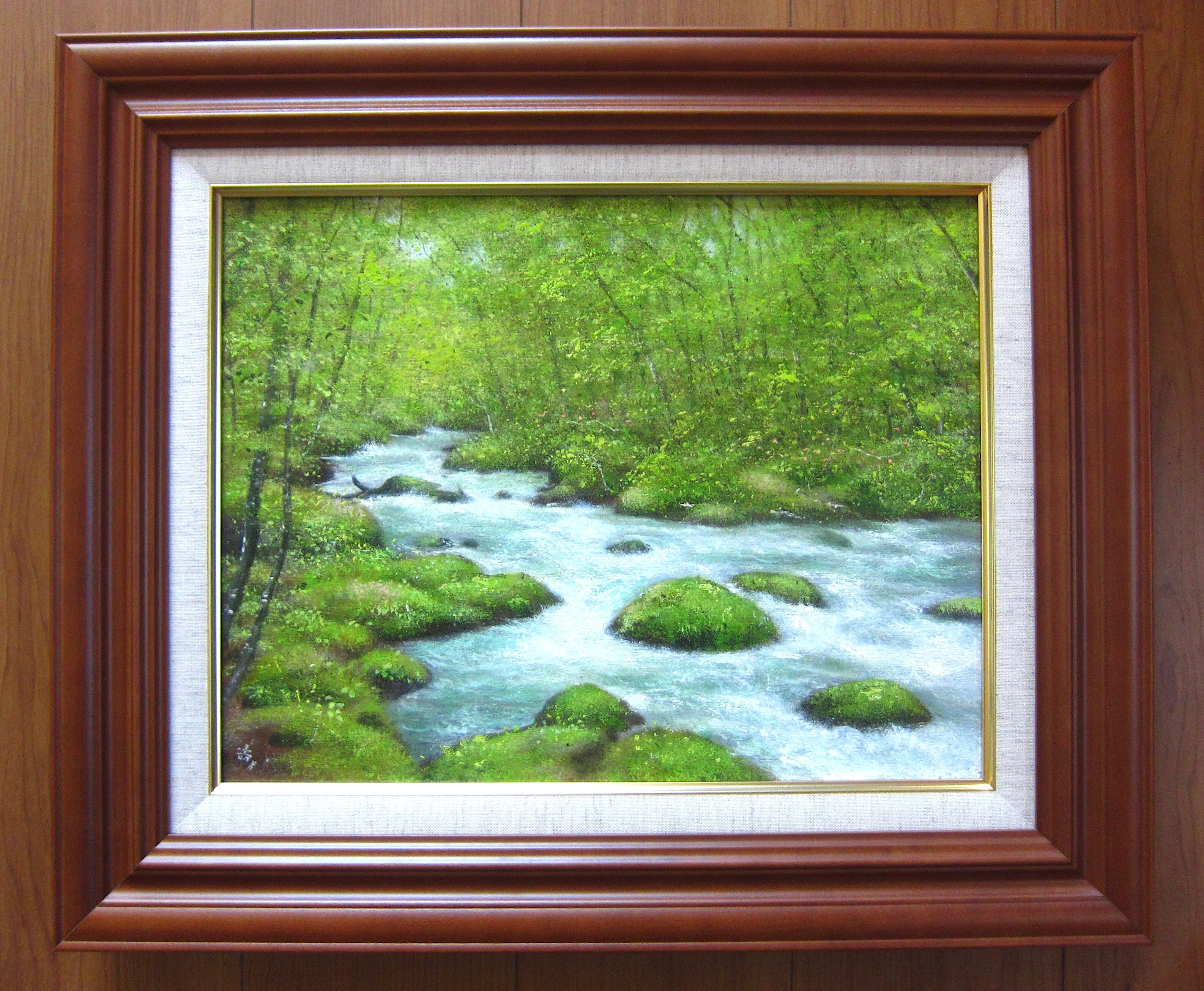 奥入瀬の美しい自然を彷彿とさせる、F6サイズの油彩画です。手間暇かけて美しく描かれた木々や流れる川など、細かい部分まで緻密に表現されています。